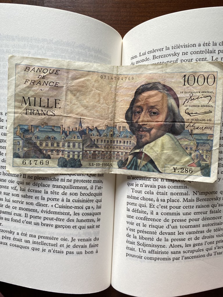 Je me souviens qu’un jour, à la lisière de l’enfance et de l’adolescence, j’avais reçu en cadeau un billet de 1000 francs (3) pour un bon classement à l’école. Un lien intense, voire tragique, s’était tissé au moment où cette récompense est passée de la main généreuse vers la mienne. Le droit d’usage de ce billet m’était intégralement transféré, je sentais la puissance dont ma main était subitement pourvue, en détenant ce billet où s’exposait la face du cardinal de Richelieu. La morgue de cette figure du plein pouvoir me semblait capable de m’ouvrir les portes de tous les rêves. Il fallait réfléchir à la meilleure façon d’utiliser la liberté d’achat qui venait de m’être accordée en abondance. Peut-être devrais-je d’abord soustraire ce concentré de richesse du regard des autres, afin de ne pas attiser leurs tentations… la vie avait pris une couleur pastel de soleil-levant, depuis que ce billet faisait partie de mon patrimoine. Les préoccupations de la journée et de celle du lendemain ne valaient pas autant que le chiffre 1000 dont le nombre de zéros me semblait interminable. Un horizon lointain venait de s’ouvrir, chargé de légèreté.